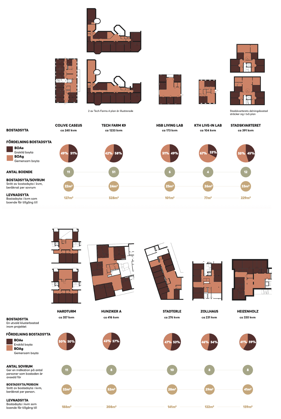 I projektet valde vi ut ett antal fallstudier för att studera rumslig organisering och kopplingar till typ av gemenskap, grader av funktionsdelning och bostadsprogram. Vi studerade främst svenska delningsbostäder samt internationella klusterbostäder. Syftet var att samla en bredare kunskap om arkitekturen för att informera utvecklingen av projektets prototyper.