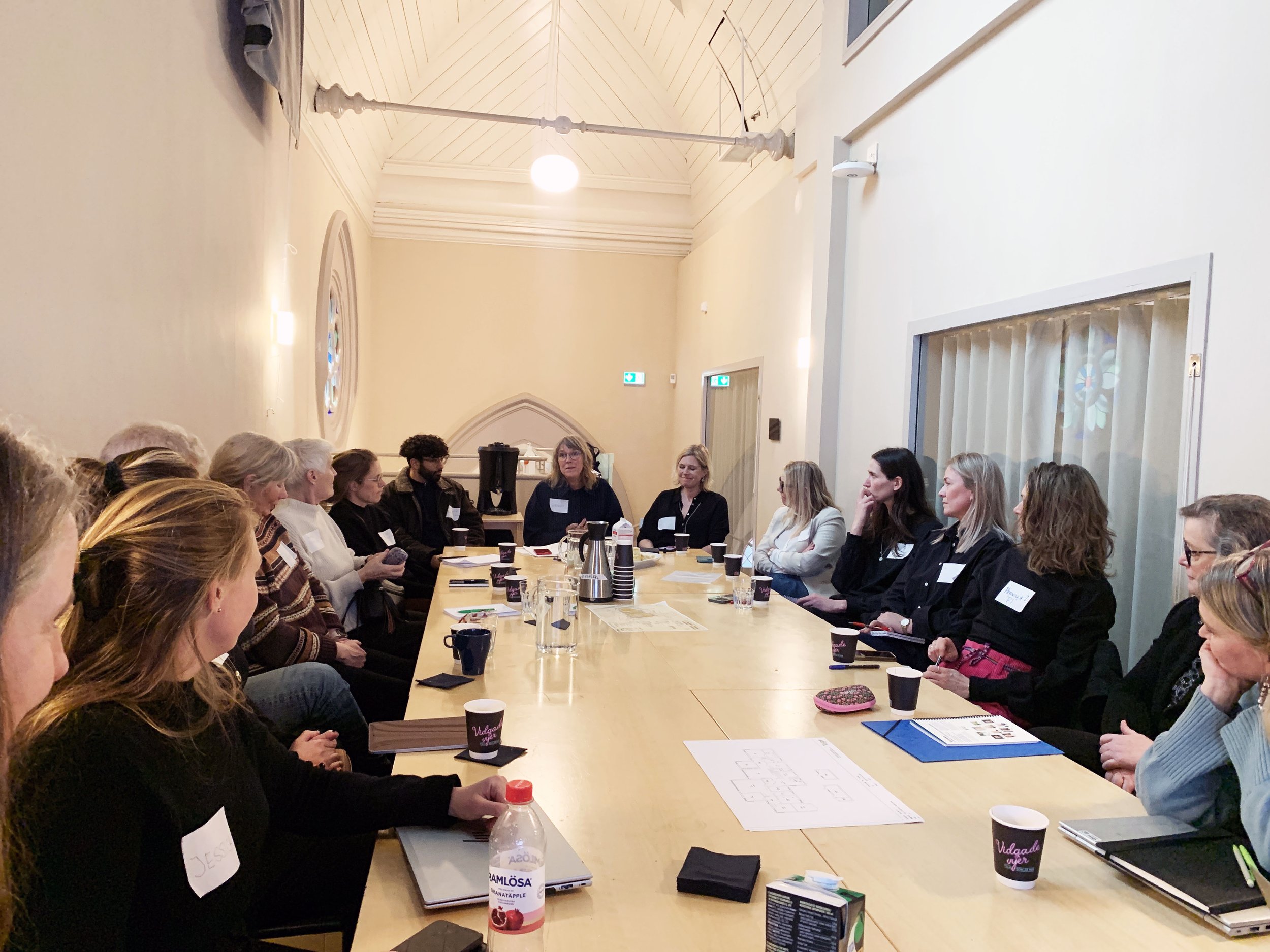 Runt bordet fanns arkitekter, forskare, fastighetsstrateger, utredare och representanter från kommuner och civilsamhälle. Under samtalet definierades bland annat svårigheter i bolagsövergripande samarbeten, hinder i lagstiftning, behov av ekonomiska incitament och beteendeförändringar samt att bryta normer. Behov av att skapa plattformar för matchning av outnyttjade fastigheter med behovsägare, en slags “tinder” för fastigheter som står tomma och är möjliga att bygga om och som söker en behovsägare i kommunala förvaltningar och bolag, privata fastighetsutvecklare eller aktörer i civilsamhället. Två deltagare bidrog med erfarenheter från konkreta projekt utifrån vilka vi diskuterade hinder och möjligheter, vilket var värdefullt.